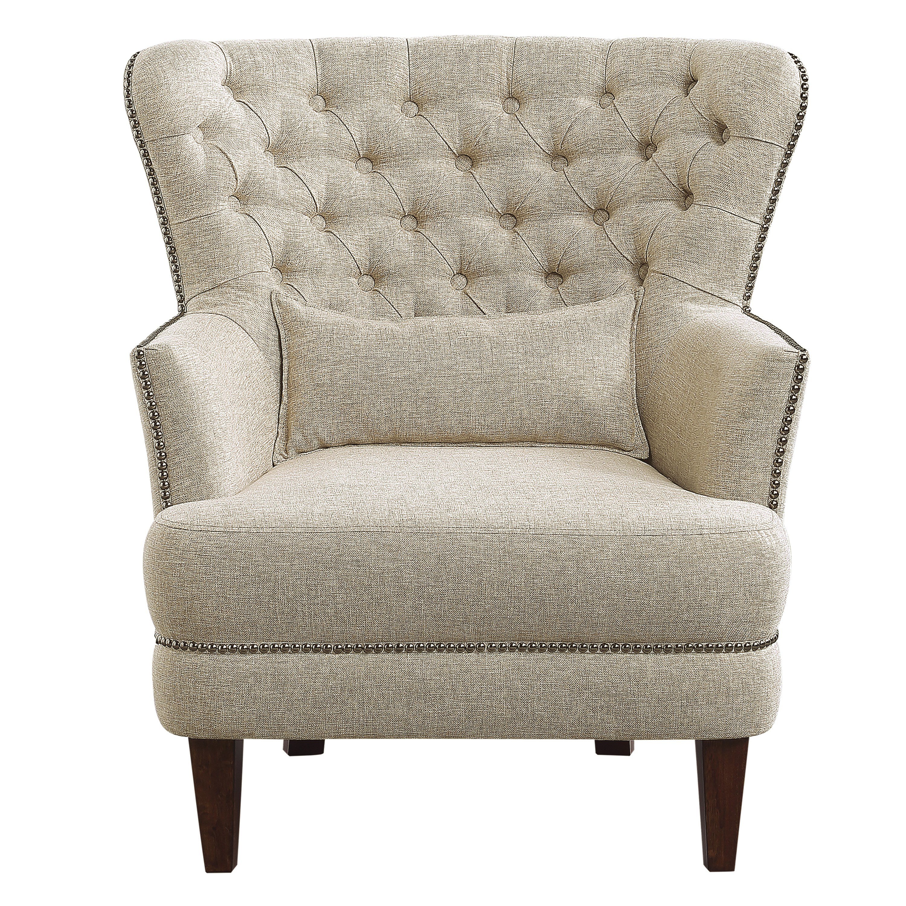 The elegant profile of the high flair-back Marriana Collection, lends distinct accent to your traditional living space. The beige fabric is paired with nailhead trim, wood legs and button tufting, each element providing distinct character to the timeless look of the chair.PRODUCT DIMENSIONS: Overall Dimension: 34" x 34.5" x 37.5"HSeat Width: 22"Seat Depth: 24.5"Seat Height: 17.5"Arm height: 25"Pillow dimension: 19"x 9" (1)Listing Includes: One Accent Chair Only.Side Table: Not Included.Simple Assembly Require.